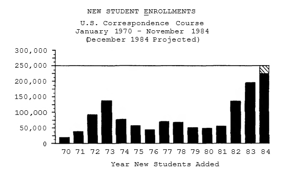 This month marks the 30th anniversary of the Ambassador College Bible Correspondence Course. In that time over two million people worldwide have enrolled. In 1984, students have been added in record numbers. Through November of this year 225,000 were enrolled in the United States alone. The following graph shows the number of new student enrollments (U.S. figures) from 1970 to the present: